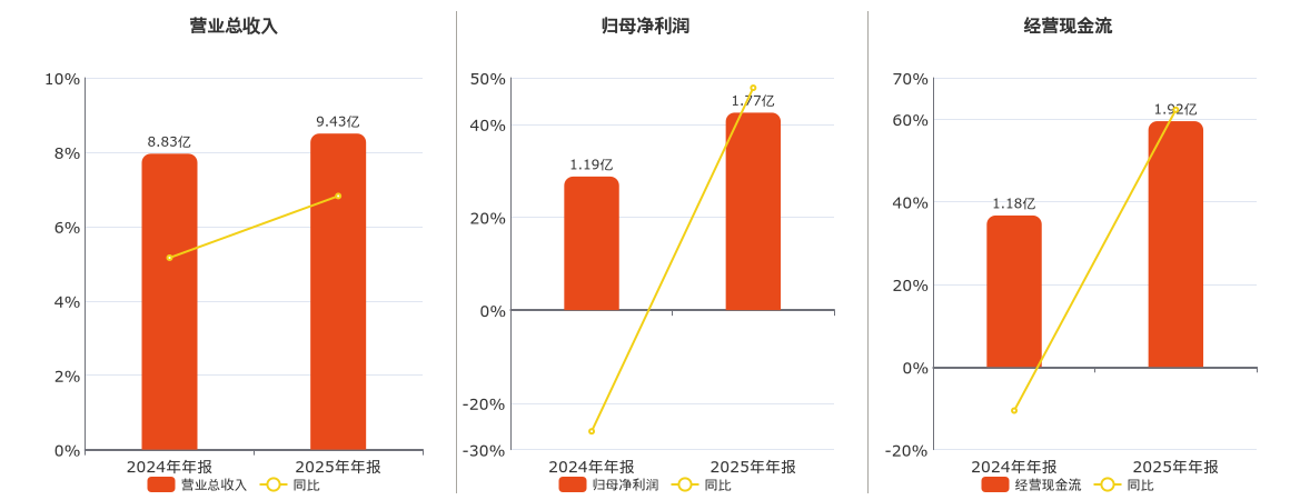 公司营业总收入为9.43亿元,在已披露的同业公司中排名第49。归母净利润为1.77亿元。经营活动现金净流入为1.92亿元,在已披露的同业公司中排名第42。