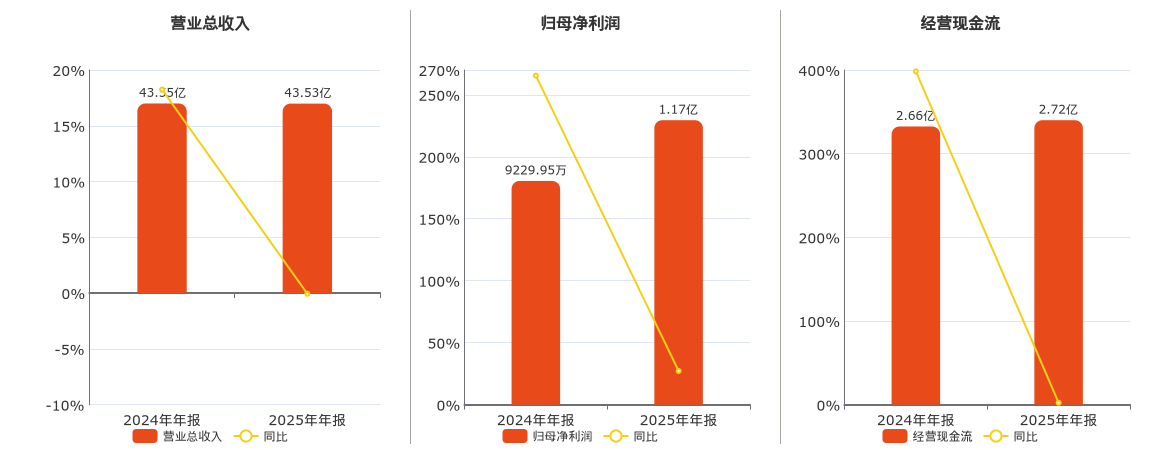 公司营业总收入为43.53亿元,较去年同报告期营业总收入减少247.09万元,同比较去年同期下降0.06%。归母净利润为1.17亿元。经营活动现金净流入为2.72亿元。