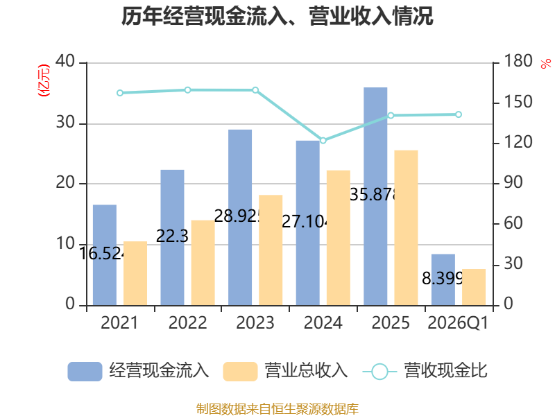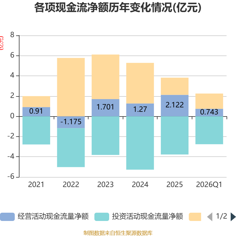 截至2026年一季度末,公司经营活动现金流净额为7432.54万元,同比增长65.65%;筹资活动现金流净额1.51亿元,同比增加3491.41万元;投资活动现金流净额-2.76亿元,上年同期为209.66万元。