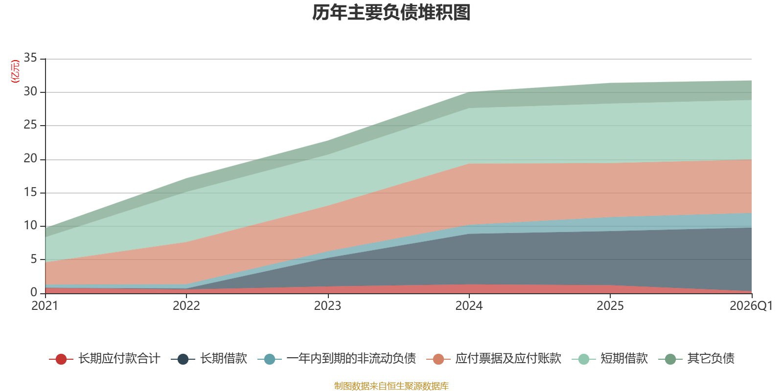负债重大变化方面,截至2026年一季度末,公司长期借款较上年末增加17.47%,占公司总资产比重上升3.2个百分点;长期应付款合计较上年末减少73.64%,占公司总资产比重下降1.99个百分点;应付职工薪酬较上年末减少18.08%,占公司总资产比重下降0.27个百分点;一年内到期的非流动负债较上年末增加4.81%,占公司总资产比重上升0.23个百分点。