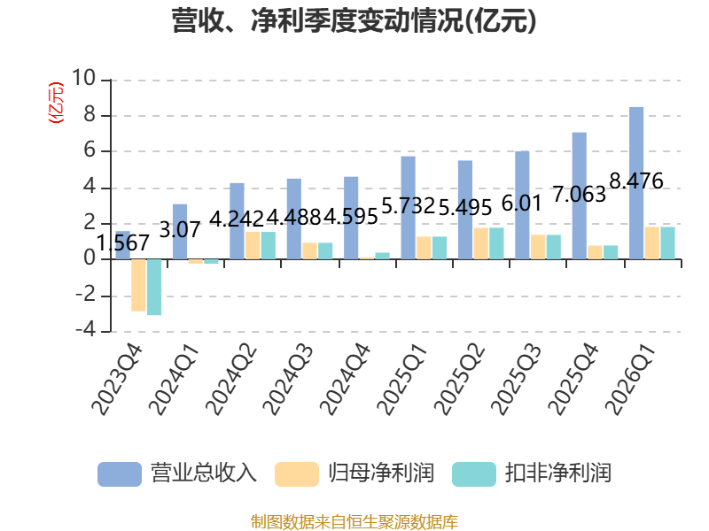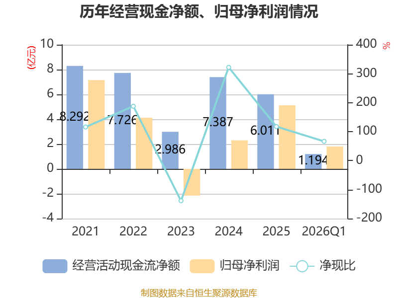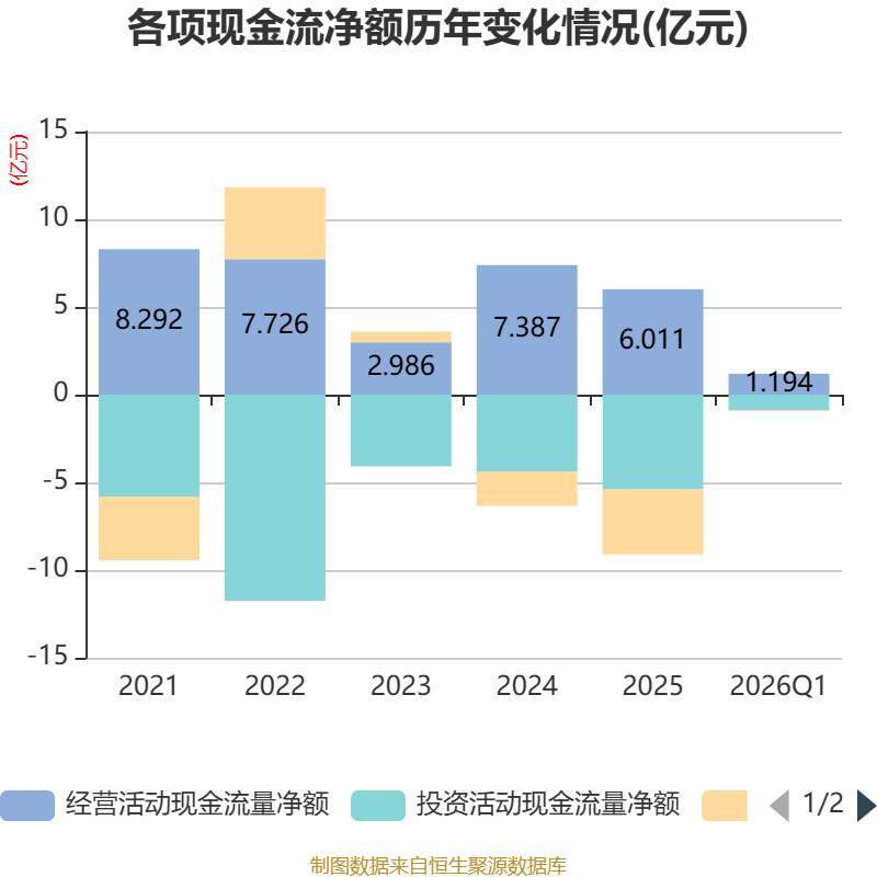 截至2026年一季度末,公司经营活动现金流净额为1.19亿元,同比增长15.62%;筹资活动现金流净额-472.35万元,同比增加1.11亿元;投资活动现金流净额-8875.92万元,上年同期为-9313.88万元。