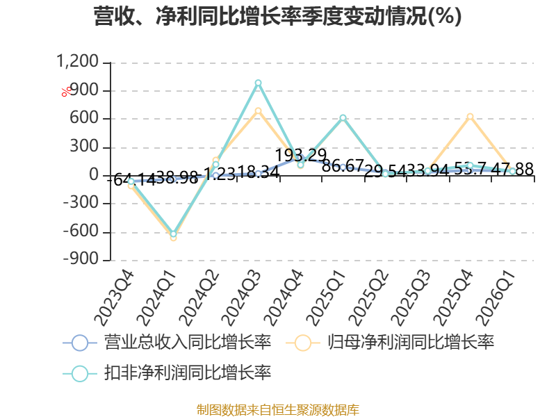 资产重大变化方面,截至2026年一季度末,公司固定资产较上年末减少4.74%,占公司总资产比重下降2.24个百分点;在建工程合计较上年末增加12.01%,占公司总资产比重上升1.45个百分点;应收票据及应收账款较上年末增加221.01%,占公司总资产比重上升0.72个百分点;货币资金较上年末增加130.54%,占公司总资产比重上升0.39个百分点。