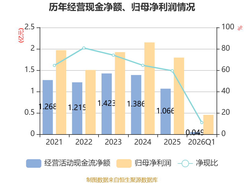 截至2026年一季度末,公司经营活动现金流净额为494.02万元,同比下降81.63%;筹资活动现金流净额338.48万元,同比增加251.03万元;投资活动现金流净额-6149.32万元,上年同期为-1.45亿元。