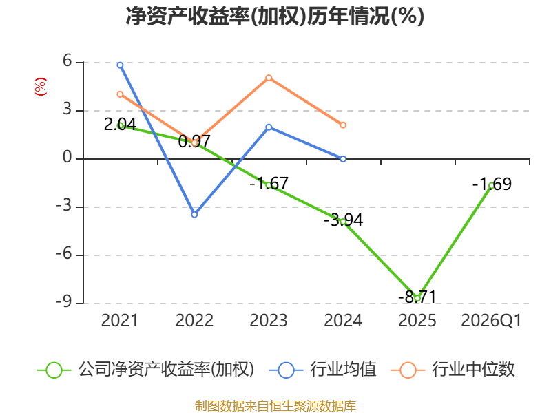 盈利能力方面, 2026年一季度公司加权平均净资产收益率为-1.69%,同比下降0.09个百分点。公司2026年第一季度投入资本回报率为-1.63%,较上年同期持平。