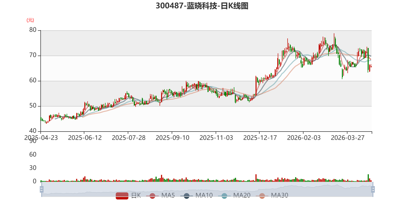 中证智能财讯蓝晓科技(300487)4月23日披露2026年第一季度报告。公司实现营业总收入6.07亿元,同比增长5.24%;归母净利润1.82亿元,同比下降5.81%;扣非净利润1.81亿元,同比下降4.92%;经营活动产生的现金流量净额为2亿元,同比增长36.59%;报告期内,蓝晓科技基本每股收益为0.36元,加权平均净资产收益率为4.04%。
