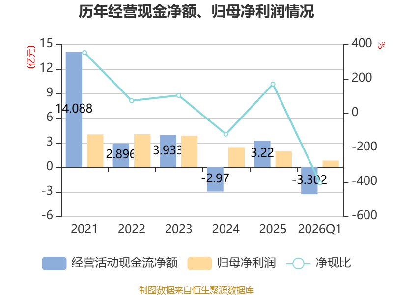 截至2026年一季度末,公司经营活动现金流净额为-3.3亿元,同比减少2.61亿元;筹资活动现金流净额3.84亿元,同比增加1.57亿元;投资活动现金流净额6081.02万元,上年同期为-9661.2万元。