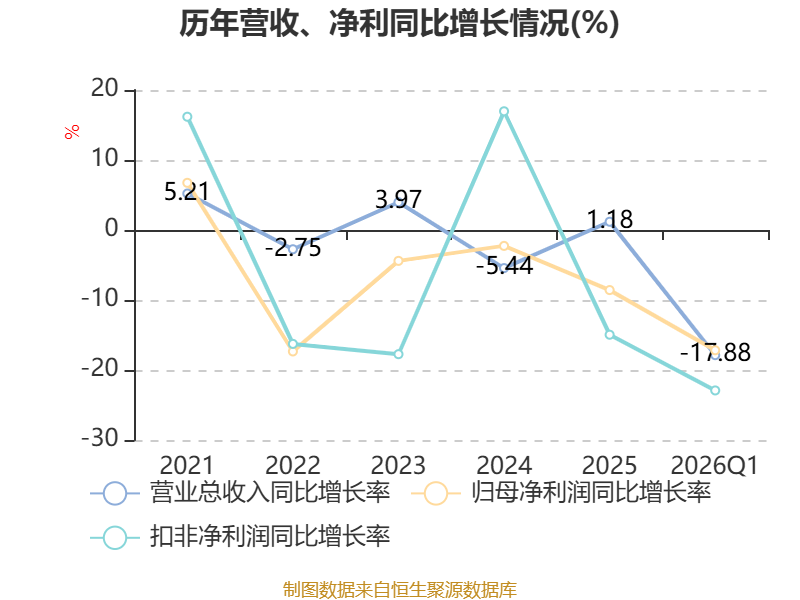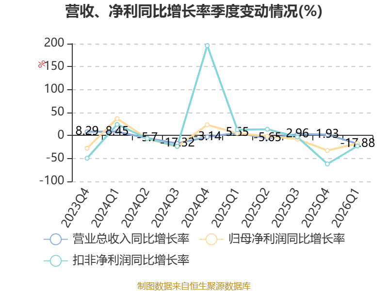 中证智能财讯富维股份(600742)4月23日披露2026年第一季度报告。公司实现营业总收入39.08亿元,同比下降17.88%;归母净利润8199.27万元,同比下降17.18%;扣非净利润6486.42万元,同比下降22.92%;经营活动产生的现金流量净额为5.4亿元,同比增长144.22%;报告期内,富维股份基本每股收益为0.1103元,加权平均净资产收益率为0.97%。