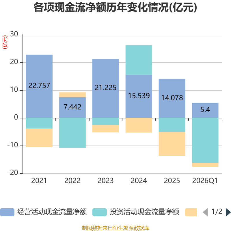 截至2026年一季度末,公司经营活动现金流净额为5.4亿元,同比增长144.22%;筹资活动现金流净额-1.42亿元,同比减少2959.54万元;投资活动现金流净额-16.26亿元,上年同期为-1839.86万元。