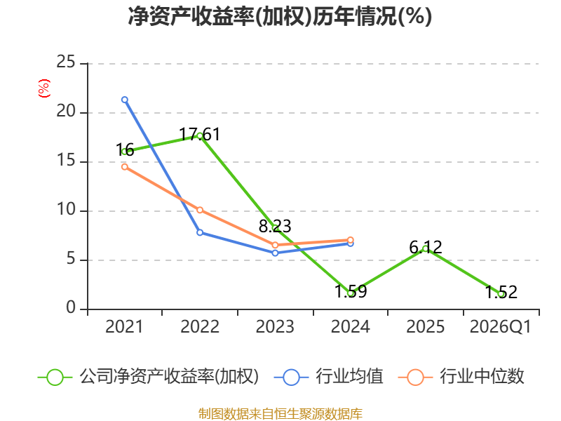 盈利能力方面, 2026年一季度公司加权平均净资产收益率为1.52%,同比下降0.94个百分点。公司2026年第一季度投入资本回报率为1.38%,较上年同期下降0.36个百分点。