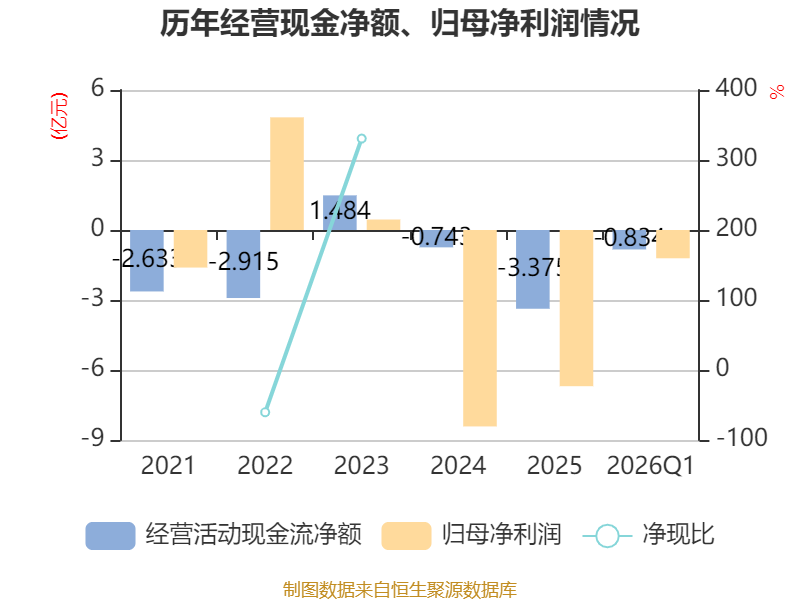 截至2026年一季度末,公司经营活动现金流净额为-8337.87万元,同比增加6469.99万元;筹资活动现金流净额-8596.06万元,同比减少2.76亿元;投资活动现金流净额-4157.04万元,上年同期为3.68亿元。