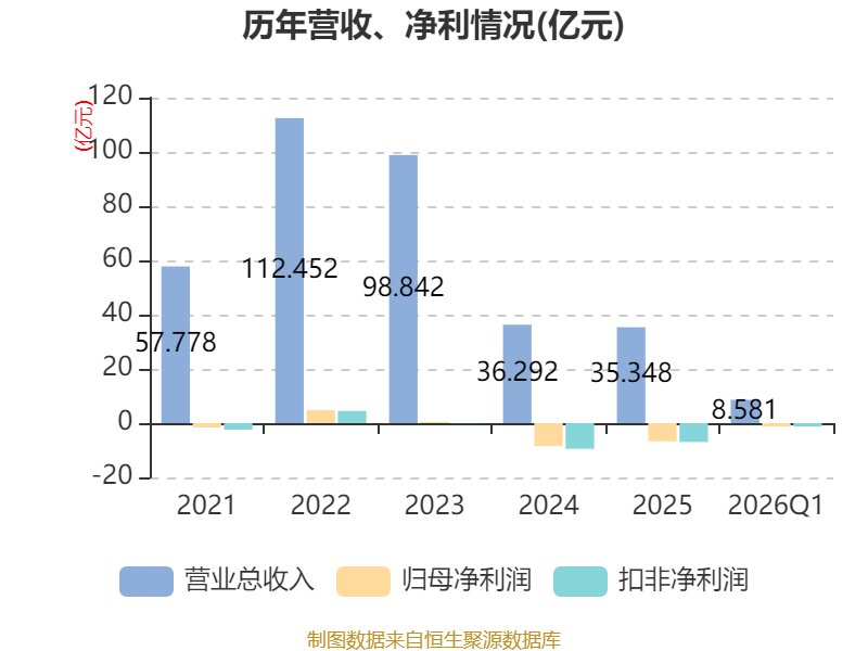 中证智能财讯易成新能(300080)4月23日披露2026年第一季度报告。公司实现营业总收入8.58亿元,同比下降17.26%;归母净利润亏损1.21亿元,上年同期亏损4198.74万元;扣非净利润亏损1.23亿元,上年同期亏损5744.5万元;经营活动产生的现金流量净额为-8337.87万元,上年同期为-1.48亿元;报告期内,易成新能基本每股收益为-0.0647元,加权平均净资产收益率为-2.78%。