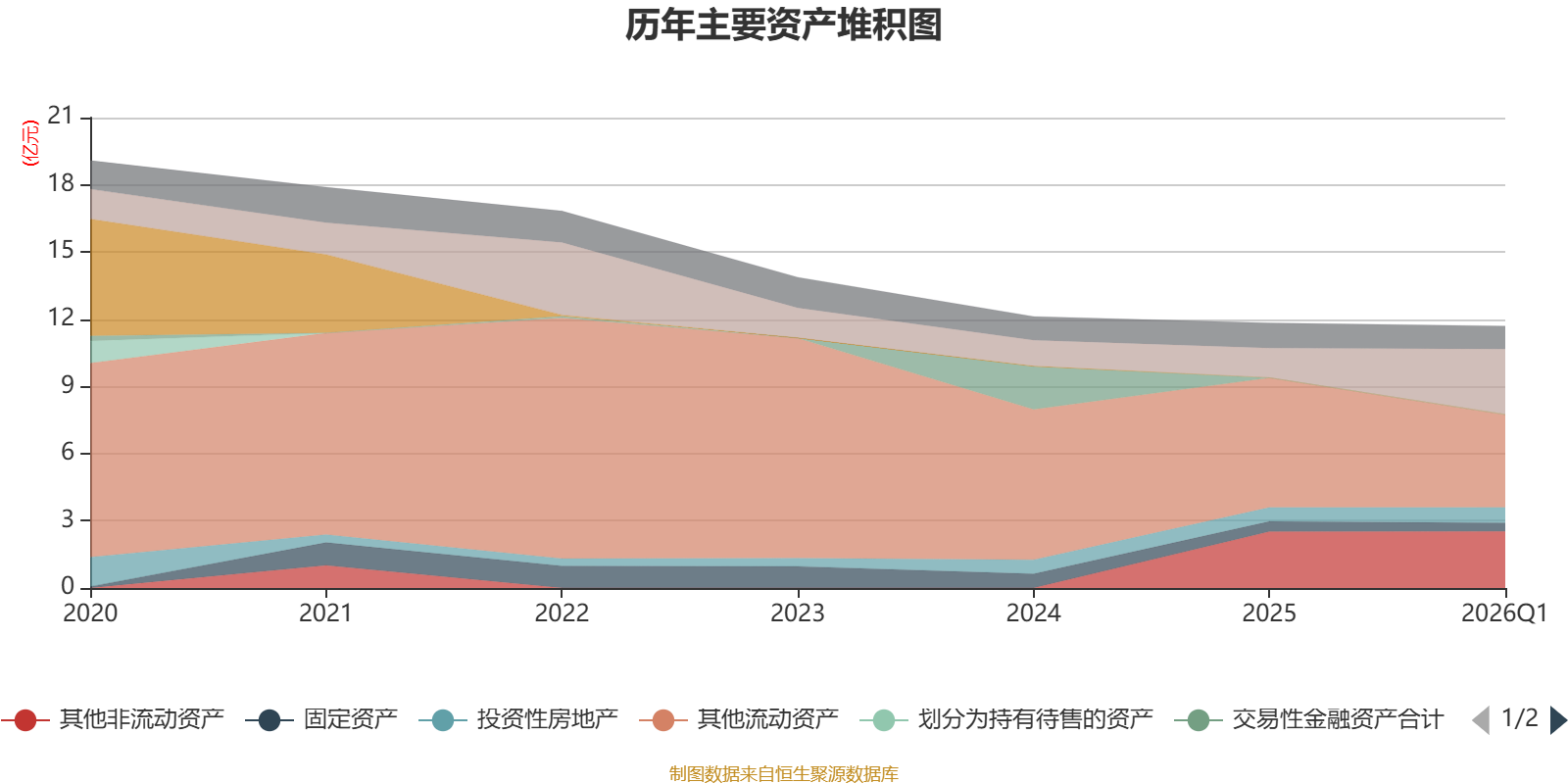 资产重大变化方面,截至2026年一季度末,公司货币资金较上年末增加120.06%,占公司总资产比重上升13.71个百分点;其他流动资产较上年末减少28.43%,占公司总资产比重下降13.5个百分点;投资性房地产较上年末增加10.35%,占公司总资产比重上升0.62个百分点;其他权益工具投资较上年末减少28.9%,占公司总资产比重下降0.56个百分点。
