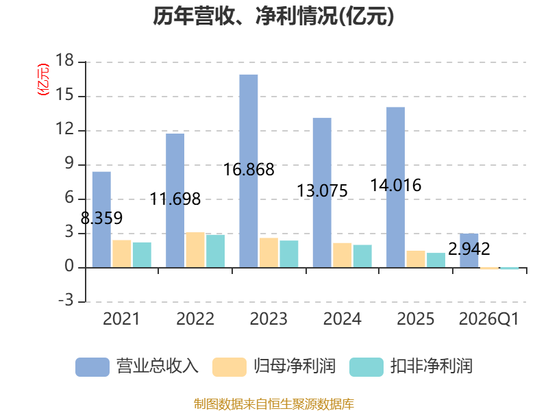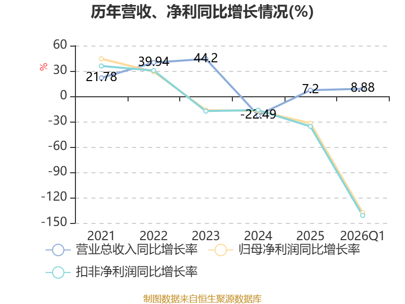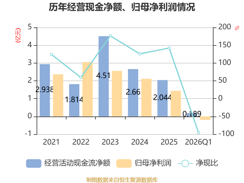 截至2026年一季度末,公司经营活动现金流净额为1891.87万元,同比下降62.97%;筹资活动现金流净额-553.6万元,同比增加1535.42万元;投资活动现金流净额-1.78亿元,上年同期为6208.71万元。
