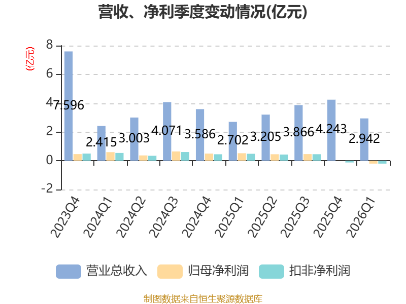 中证智能财讯博硕科技(300951)4月23日披露2026年第一季度报告。公司实现营业总收入2.94亿元,同比增长8.88%;归母净利润亏损1975.26万元,上年同期盈利5226.1万元;扣非净利润亏损1994.45万元,上年同期盈利4851.08万元;经营活动产生的现金流量净额为1891.87万元,同比下降62.97%;报告期内,博硕科技基本每股收益为-0.12元,加权平均净资产收益率为-0.85%。
