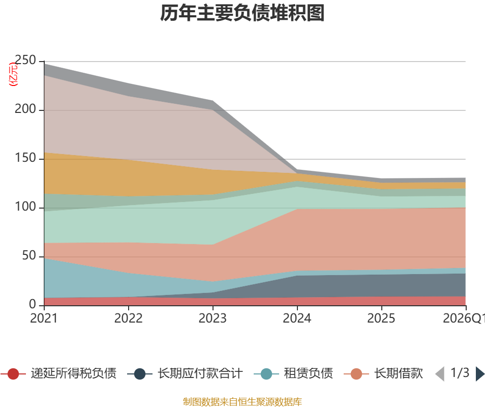 负债重大变化方面,截至2026年一季度末,公司其他应付款(含利息和股利)较上年末减少7.73%,占公司总资产比重下降0.5个百分点;长期借款较上年末减少0.76%,占公司总资产比重下降0.48个百分点;租赁负债较上年末增加18.77%,占公司总资产比重上升0.4个百分点;长期应付款合计较上年末增加4.2%,占公司总资产比重上升0.34个百分点。