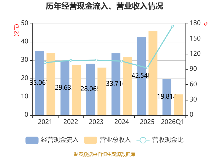 截至2026年一季度末,公司经营活动现金流净额为-5.06亿元,同比减少4.21亿元;筹资活动现金流净额2.42亿元,同比增加2.44亿元;投资活动现金流净额3826.27万元,上年同期为-1.33亿元。