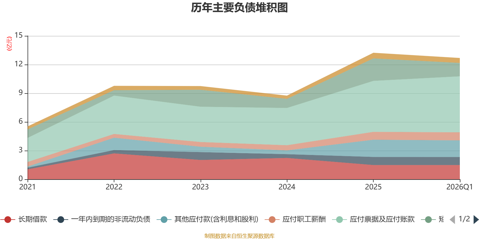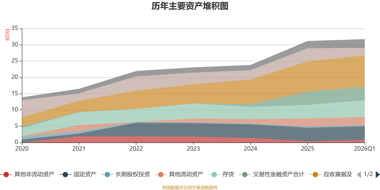 资产重大变化方面,截至2026年一季度末,公司货币资金较上年末减少42.81%,占公司总资产比重下降5.7个百分点;存货较上年末增加23.49%,占公司总资产比重上升2.85个百分点;应收款项融资较上年末增加77.4%,占公司总资产比重上升1.74个百分点;其他非流动资产较上年末增加103.54%,占公司总资产比重上升1.22个百分点。