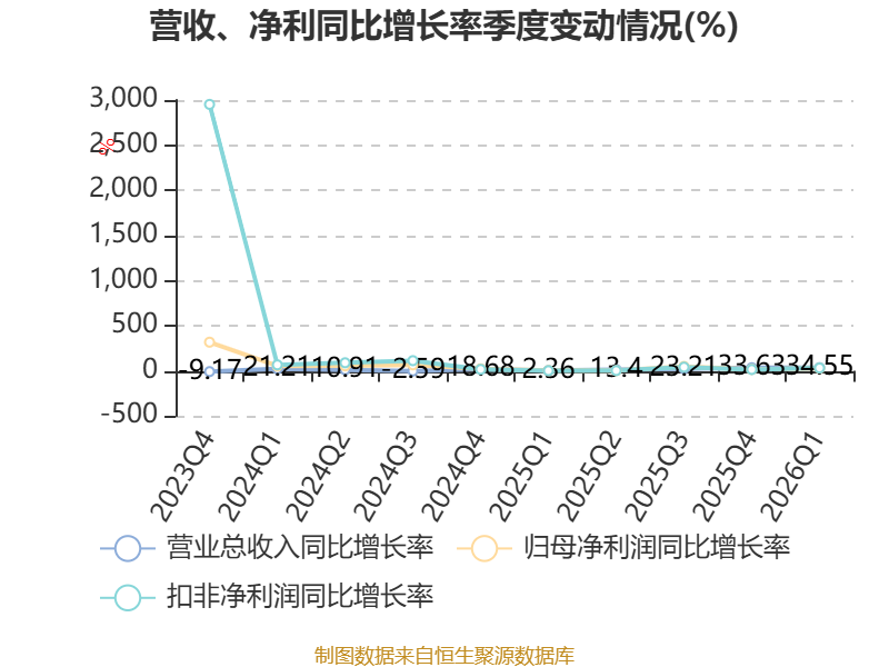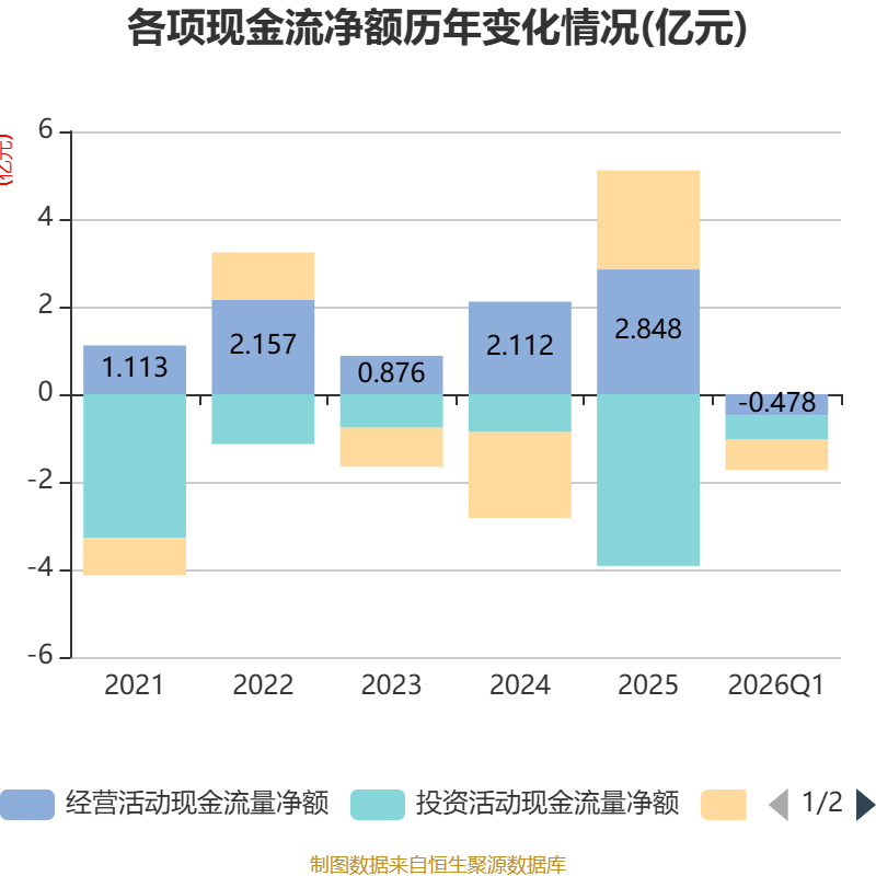 截至2026年一季度末,公司经营活动现金流净额为-4775.97万元,同比减少4411.85万元;筹资活动现金流净额-6954.16万元,同比减少1.39亿元;投资活动现金流净额-5599.7万元,上年同期为-314.44万元。