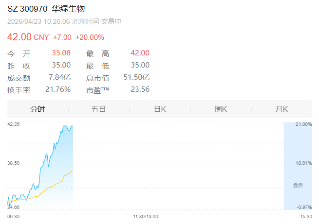 【大河财立方消息】4月23日,华绿生物盘中涨停,报42元/股。截至发稿,成交7.84亿元,换手率21.76%。