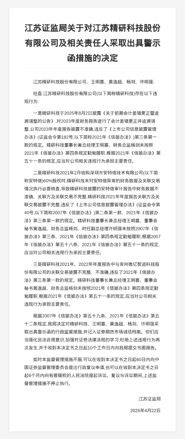 对此,江苏证监局决定对精研科技、王明喜、黄逸超、杨剑、许明强采取出具警示函的行政监管措施,并记入证券期货市场诚信档案。