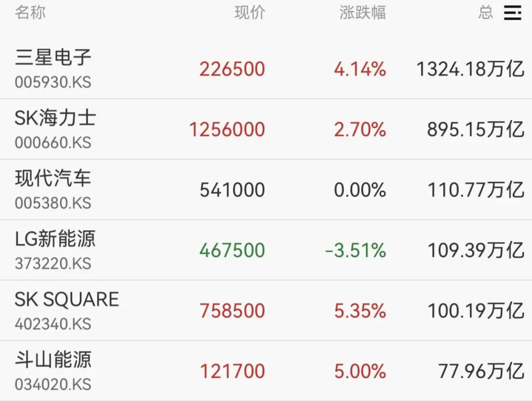 权重股方面,三星电子涨超4%创新高,SK海力士涨超2%。