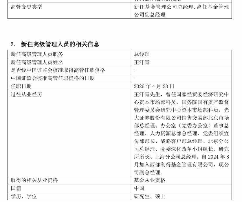 4月23日,西部利得基金官宣,公司总经理人选确定,将由公司副总经理王汗青接任。