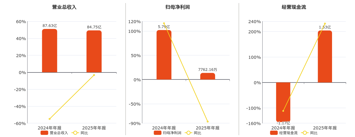 公司营业总收入为84.75亿元,较去年同报告期营业总收入减少2.88亿元,同比较去年同期下降3.29%。归母净利润为7762.16万元,较去年同报告期归母净利润减少5.02亿元,同比较去年同期下降86.60%。经营活动现金净流入为1.53亿元。