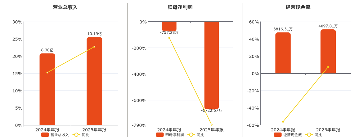 公司营业总收入为10.19亿元,在已披露的同业公司中排名第39。归母净利润为-6722.67万元,在已披露的同业公司中排名第47,较去年同报告期归母净利润减少5965.39万元。经营活动现金净流入为4097.81万元,在已披露的同业公司中排名第39。