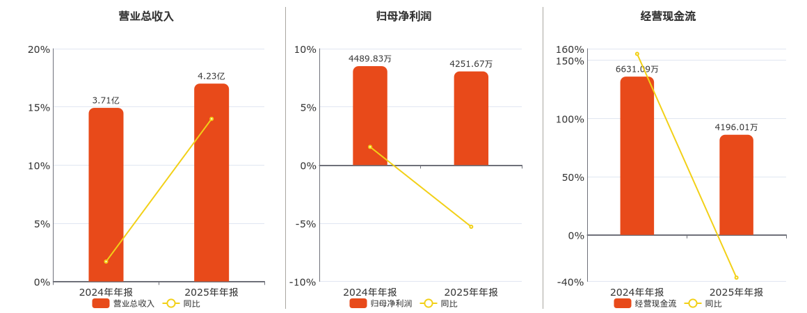 公司营业总收入为4.23亿元,在已披露的同业公司中排名第105。归母净利润为4251.67万元,在已披露的同业公司中排名第87,较去年同报告期归母净利润减少238.16万元,同比较去年同期下降5.30%。经营活动现金净流入为4196.01万元,在已披露的同业公司中排名第95,较去年同报告期经营活动现金净流入减少2435.08万元,同比较去年同期下降36.72%。