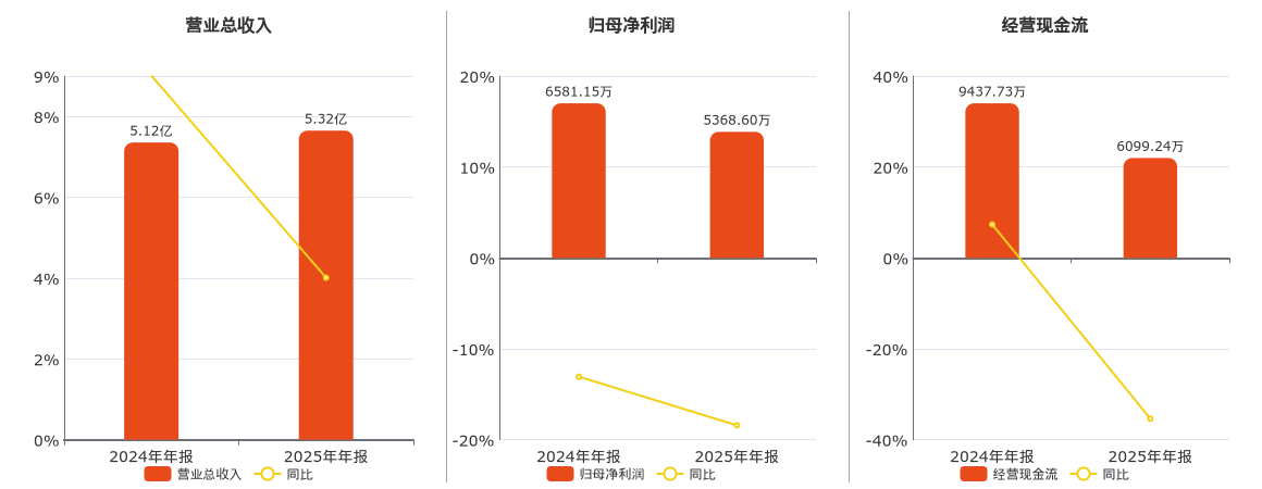 公司营业总收入为5.32亿元,在已披露的同业公司中排名第48。归母净利润为5368.60万元,在已披露的同业公司中排名第38,较去年同报告期归母净利润减少1212.54万元,同比较去年同期下降18.42%。经营活动现金净流入为6099.24万元,在已披露的同业公司中排名第36,较去年同报告期经营活动现金净流入减少3338.48万元,同比较去年同期下降35.37%。