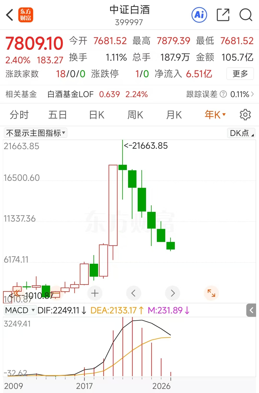 自2021年2月18日盘中创出历史新高,中证白酒指数年K线已6年阴,最大回撤幅度达到65%。个股而言,酒鬼酒、舍得酒业、水井坊、顺鑫农业、金种子酒、洋河股份等最大回撤幅度超过75%,等同于是“腰斩再腰斩”。