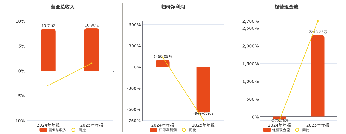 公司营业总收入为10.90亿元。归母净利润为-9494.09万元,在已披露的同业公司中排名第119,较去年同报告期归母净利润减少1.10亿元,同比较去年同期下降750.71%。经营活动现金净流入为7248.23万元,在已披露的同业公司中排名第75。