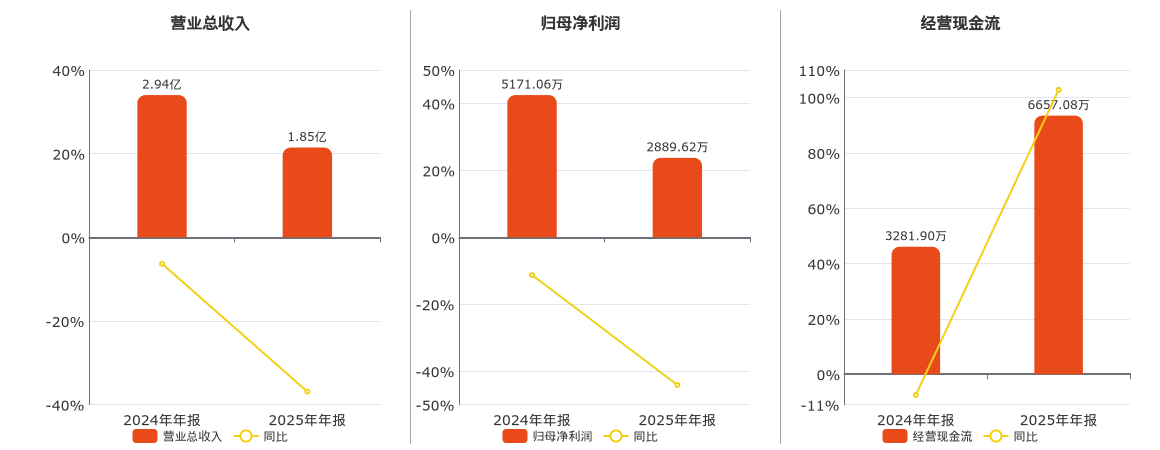 公司营业总收入为1.85亿元,在已披露的同业公司中排名第67,较去年同报告期营业总收入减少1.08亿元,同比较去年同期下降36.89%。归母净利润为2889.62万元,在已披露的同业公司中排名第38,较去年同报告期归母净利润减少2281.44万元,同比较去年同期下降44.12%。经营活动现金净流入为6657.08万元,在已披露的同业公司中排名第46。