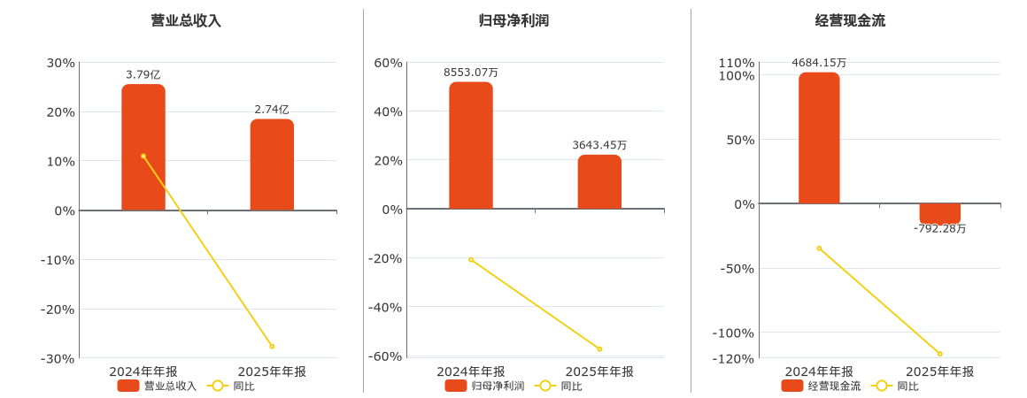 公司营业总收入为2.74亿元,较去年同报告期营业总收入减少1.05亿元,同比较去年同期下降27.67%。归母净利润为3643.45万元,较去年同报告期归母净利润减少4909.62万元,同比较去年同期下降57.40%。经营活动现金净流入为-792.28万元,较去年同报告期经营活动现金净流入减少5476.43万元,同比较去年同期下降116.91%。