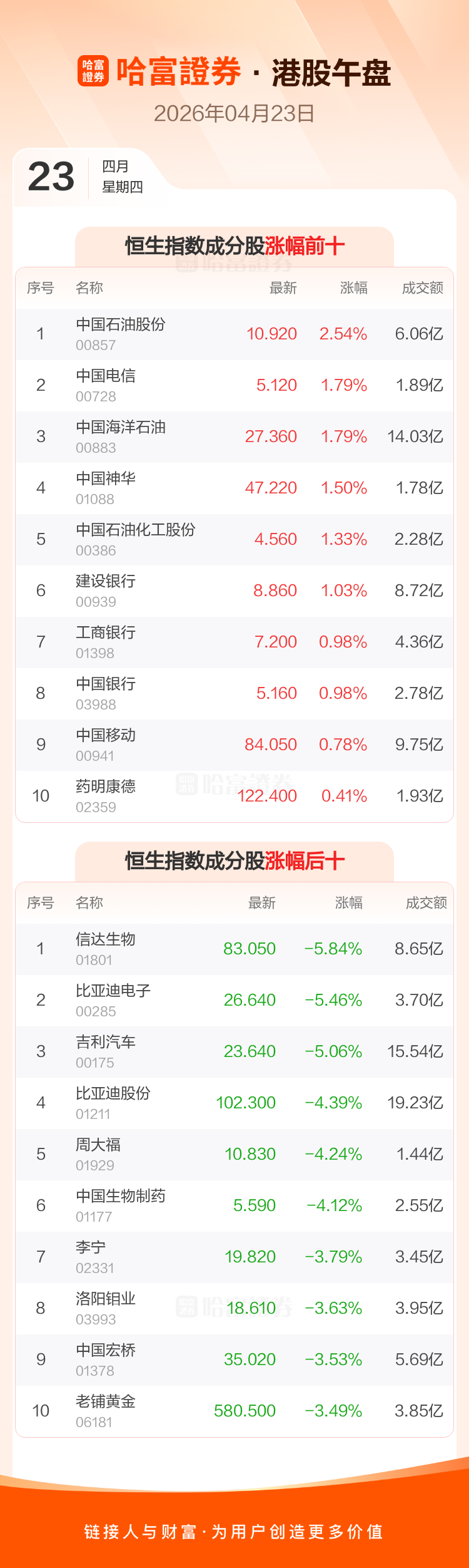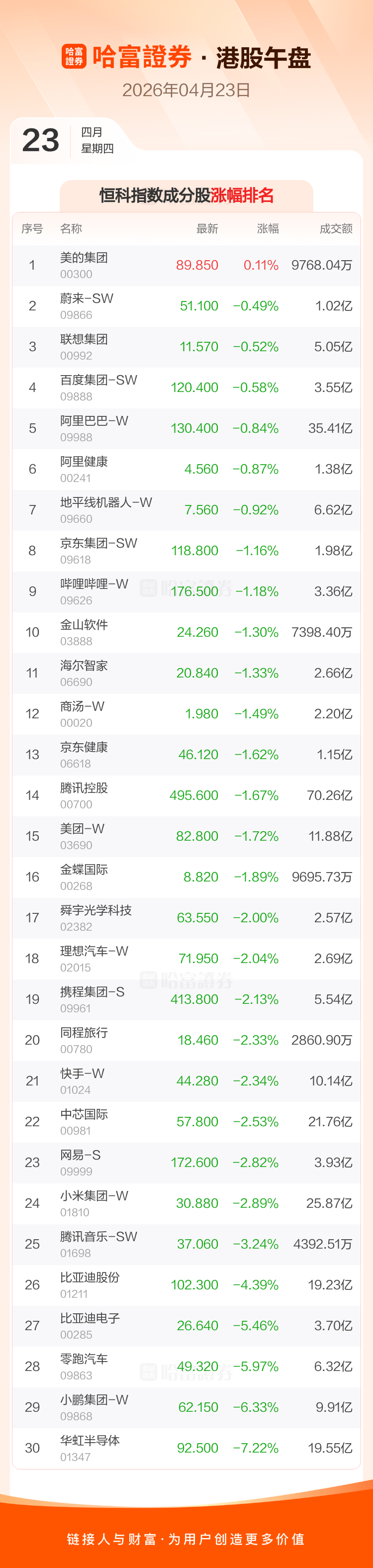 港股4月23日午盘走低,恒生指数收报25870.37点,跌292.87点,跌幅1.12%;恒生科技指数收报4849.49点,跌114.45点,跌幅2.31%。恒生指数成分股中中国石油股份、中国电信、中国海洋石油涨幅居前,信达生物、比亚迪电子、吉利汽车跌幅靠前。恒生科技指数成分股中美的集团涨幅居前,华虹半导体、小鹏集团-W、零跑汽车跌幅靠前。