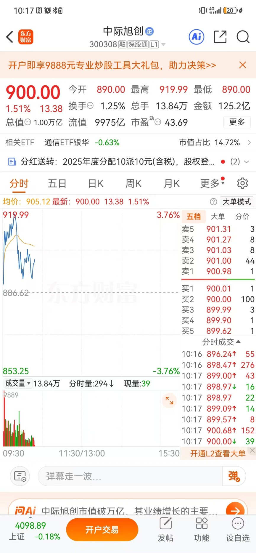 昨日盘后,光通信板块整体表现强势。同花顺数据显示,4月22日,中际旭创、新易盛、天孚通信三家公司股价均创历史新高,三家光模块公司总市值合计约1.89万亿元,超过了贵州茅台1.8万亿元的总市值。截至4月22日收盘,中际旭创总市值已达9873亿元,距离万亿元关口仅一步之遥。今日早盘顺势突破。