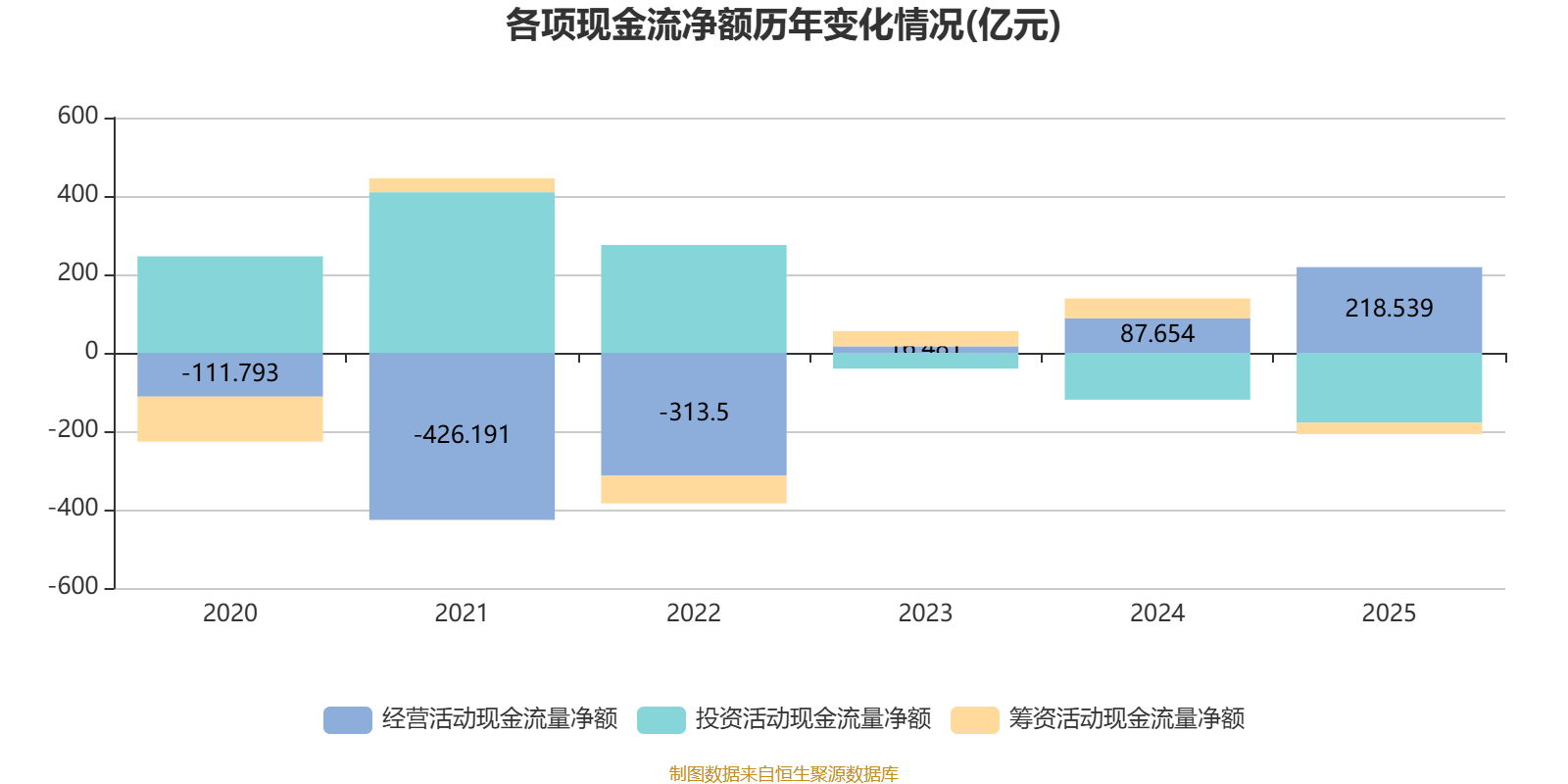 2025年,公司经营活动现金流净额为218.54亿元,同比增长149.32%;筹资活动现金流净额-28.82亿元,同比减少79.78亿元;投资活动现金流净额-178.53亿元,上年同期为-119.6亿元。