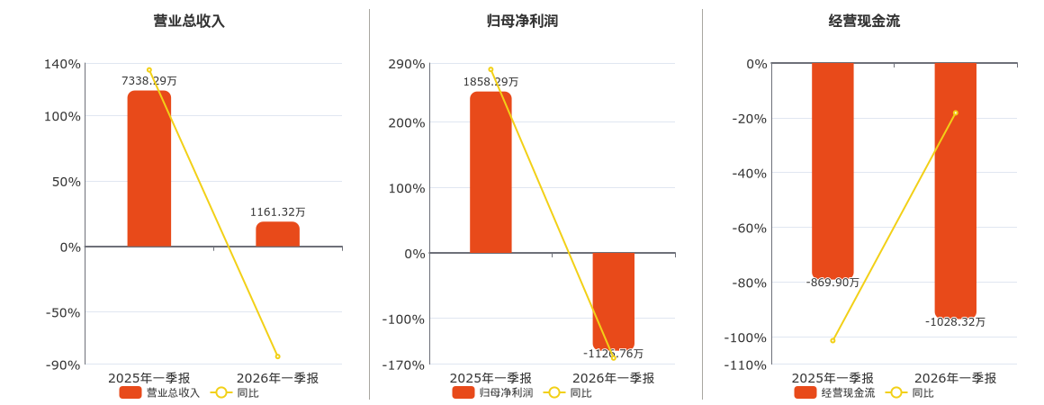 公司截至2026年3月31日,*ST凯鑫营业总收入为1161.32万元,较去年同报告期营业总收入减少6176.97万元,同比较去年同期下降84.17%。截至2026年3月31日,*ST凯鑫归母净利润为-1126.76万元,较去年同报告期归母净利润减少2985.05万元,同比较去年同期下降160.63%。截至2026年3月31日,*ST凯鑫经营活动现金净流入为-1028.32万元,较去年同报告期经营活动现金净流入减少158.43万元。
