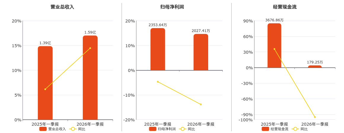 公司营业总收入为1.59亿元。归母净利润为2027.41万元,较去年同报告期归母净利润减少326.22万元,同比较去年同期下降13.86%。经营活动现金净流入为179.25万元,较去年同报告期经营活动现金净流入减少3497.62万元,同比较去年同期下降95.13%。