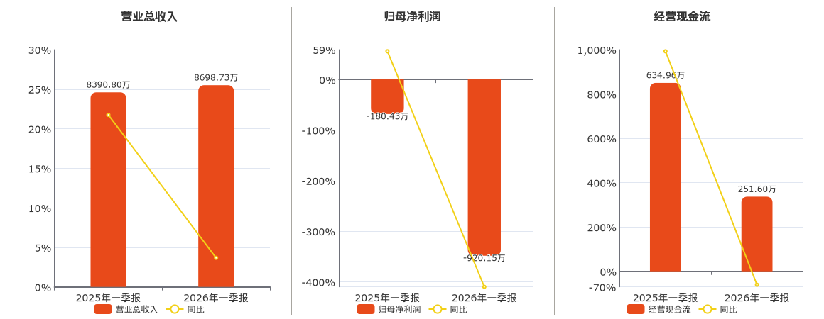 公司营业总收入为8698.73万元。归母净利润为-920.15万元,较去年同报告期归母净利润减少739.72万元。经营活动现金净流入为251.60万元,较去年同报告期经营活动现金净流入减少383.36万元,同比较去年同期下降60.38%。