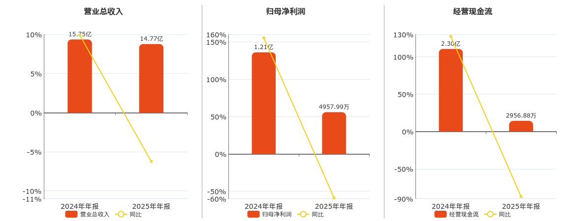 公司营业总收入为14.77亿元,较去年同报告期营业总收入减少9834.01万元,同比较去年同期下降6.24%。归母净利润为4957.99万元,较去年同报告期归母净利润减少7111.78万元,同比较去年同期下降58.92%。经营活动现金净流入为2956.88万元,较去年同报告期经营活动现金净流入减少2.00亿元,同比较去年同期下降87.12%。