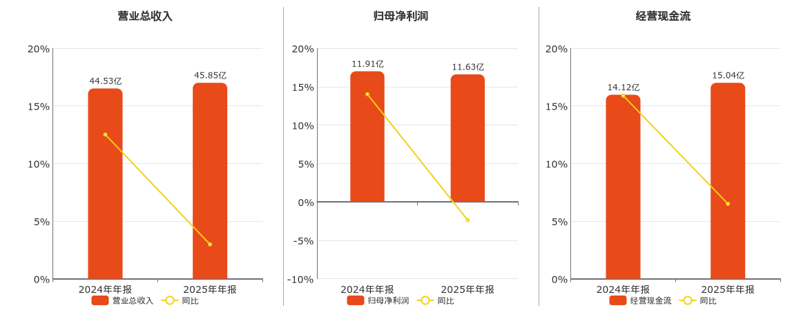 公司营业总收入为45.85亿元。归母净利润为11.63亿元,较去年同报告期归母净利润减少2826.39万元,同比较去年同期下降2.37%。经营活动现金净流入为15.04亿元。