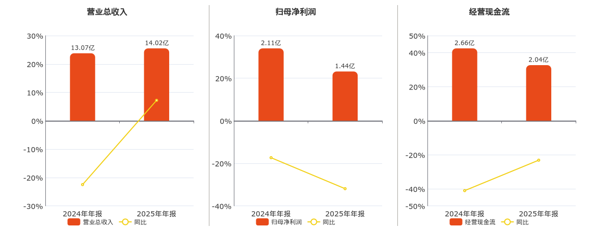 公司营业总收入为14.02亿元,在已披露的同业公司中排名第37。归母净利润为1.44亿元,较去年同报告期归母净利润减少6745.18万元,同比较去年同期下降31.91%。经营活动现金净流入为2.04亿元,在已披露的同业公司中排名第26,较去年同报告期经营活动现金净流入减少6154.29万元,同比较去年同期下降23.14%。