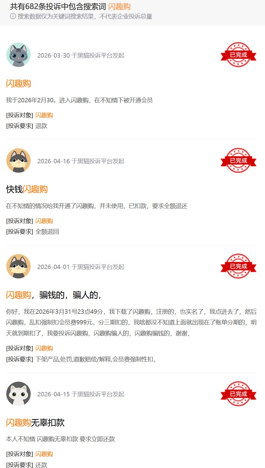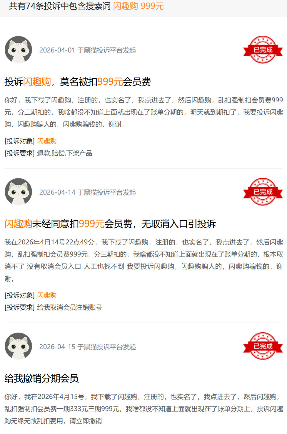 投诉的路径高度一致:用户往往被“贷款”的名义引流,随即在毫无感知的情况下,被快钱支付划走了999元的分期会员费(每期333元)。由于该笔强制账单的存在,用户的账号注销功能被锁死,客服渠道亦长期处于失效状态。按照支付行业准则,对于持牌机构,针对新商户的接入审核仅仅是第一步,更关键的是对“首月放量交易”的动态监控。然而,在闪趣购大规模触发投诉的周期内,快钱支付的防御机制并未在风险初显时关停通道。