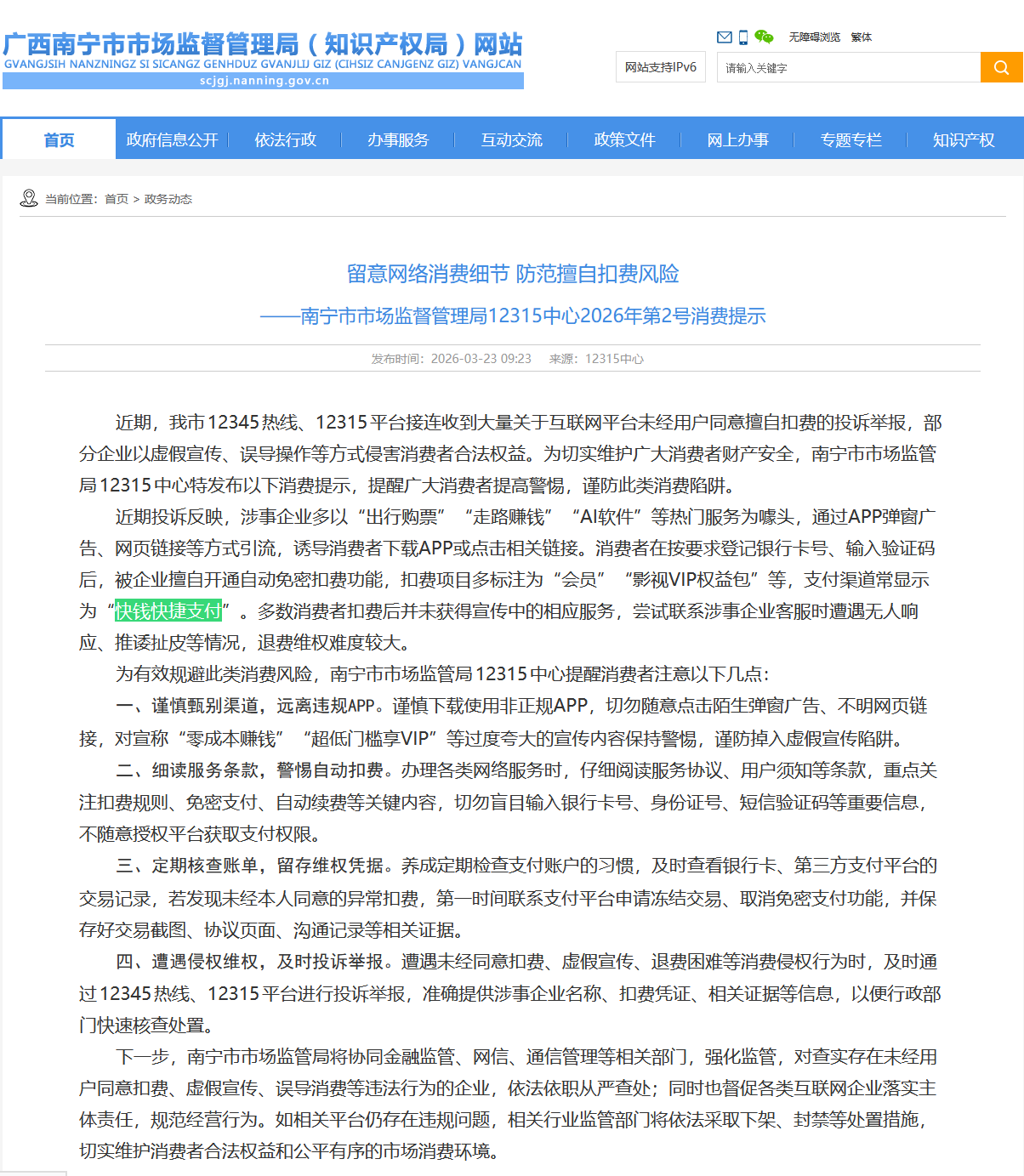 南宁市市场监督管理局在2026年3月发布的消费提示,从官方侧面印证了这种风险的普遍性。该局明确指出,近期大量投诉反映部分企业诱导消费者开通自动扣费,而背后的支付渠道常指向“快钱快捷支付”。这实际上指向了一个核心问题:快钱支付在商户持续管理与交易链路监控上,存在结构性的断点。