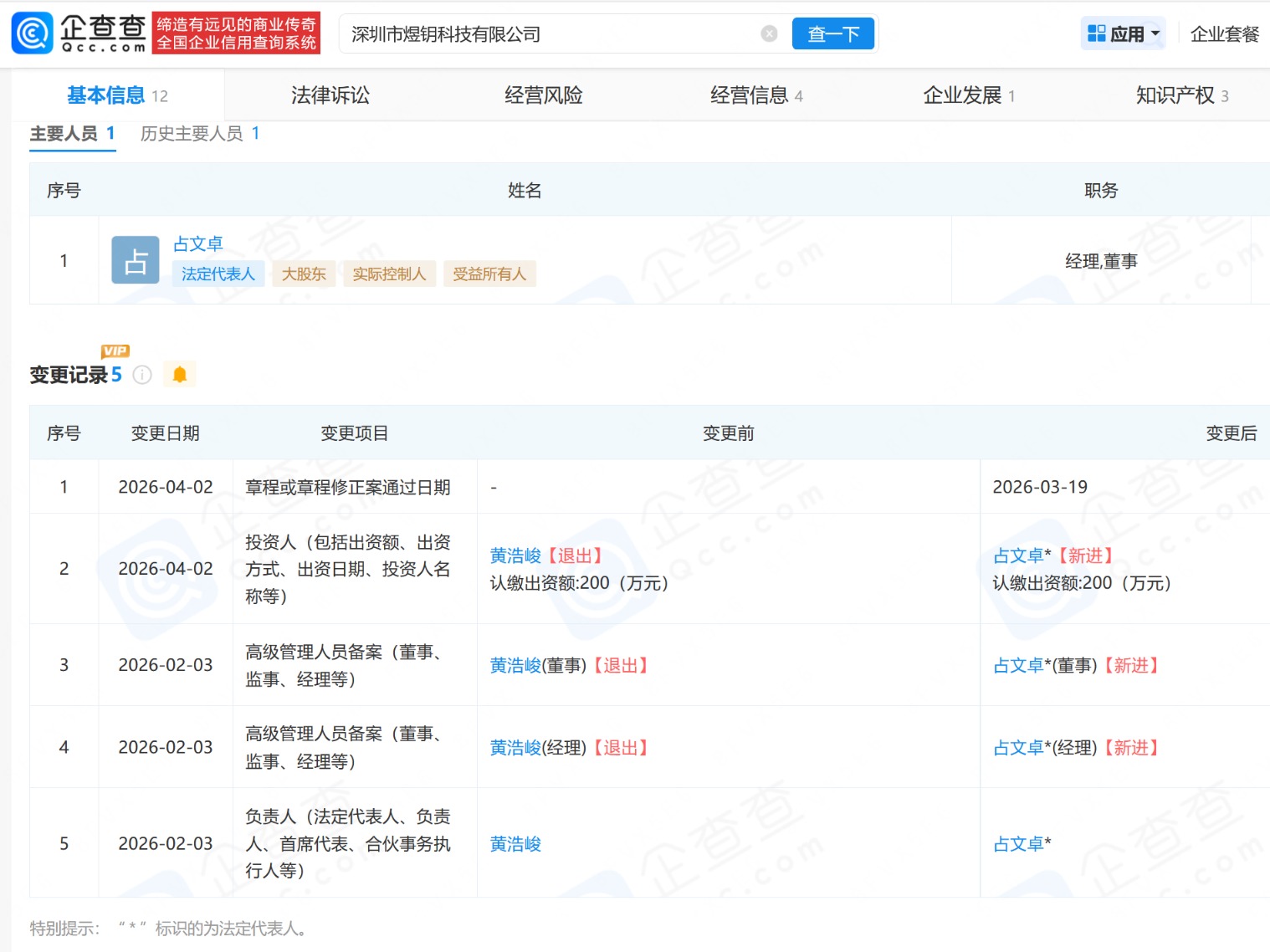 深圳市煜钥科技有限公司变更记录(来源:企查查)