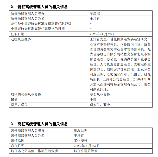 【大河财立方消息】4月23日,西部利得基金管理有限公司发布公告称,公司副总经理王汗青接任总经理。