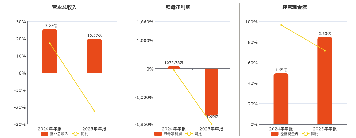 公司营业总收入为10.27亿元,在已披露的同业公司中排名第54,较去年同报告期营业总收入减少2.94亿元,同比较去年同期下降22.28%。归母净利润为-1.99亿元,在已披露的同业公司中排名第63,较去年同报告期归母净利润减少2.10亿元,同比较去年同期下降1944.78%。经营活动现金净流入为2.83亿元,在已披露的同业公司中排名第51。