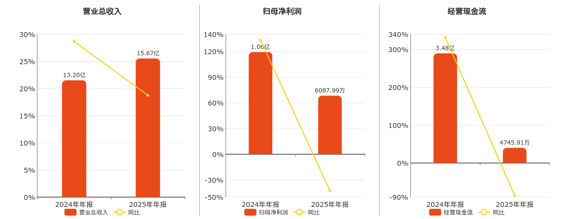 公司营业总收入为15.67亿元,在已披露的同业公司中排名第29。归母净利润为6087.99万元,在已披露的同业公司中排名第27,较去年同报告期归母净利润减少4549.63万元,同比较去年同期下降42.77%。经营活动现金净流入为4745.91万元,在已披露的同业公司中排名第39,较去年同报告期经营活动现金净流入减少3.00亿元,同比较去年同期下降86.35%。