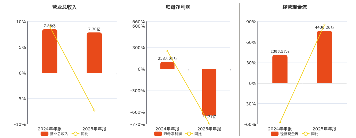 公司营业总收入为7.30亿元,较去年同报告期营业总收入减少5801.19万元,同比较去年同期下降7.36%。归母净利润为-1.71亿元,较去年同报告期归母净利润减少1.97亿元,同比较去年同期下降762.57%。经营活动现金净流入为4436.26万元。